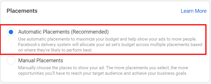 You can also select manual placement, we recommend Facebook & Instagram feed, it is your choice.