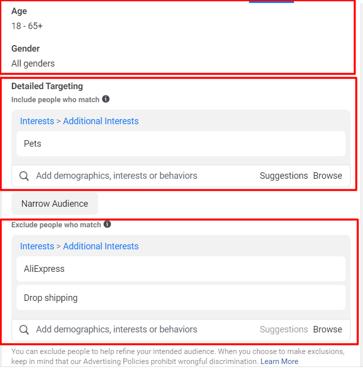 As a target interest, if we sell something to pets, select pets and click on ‘suggestions’, select from there other interests related to that interest, as broadas possible +1 million.